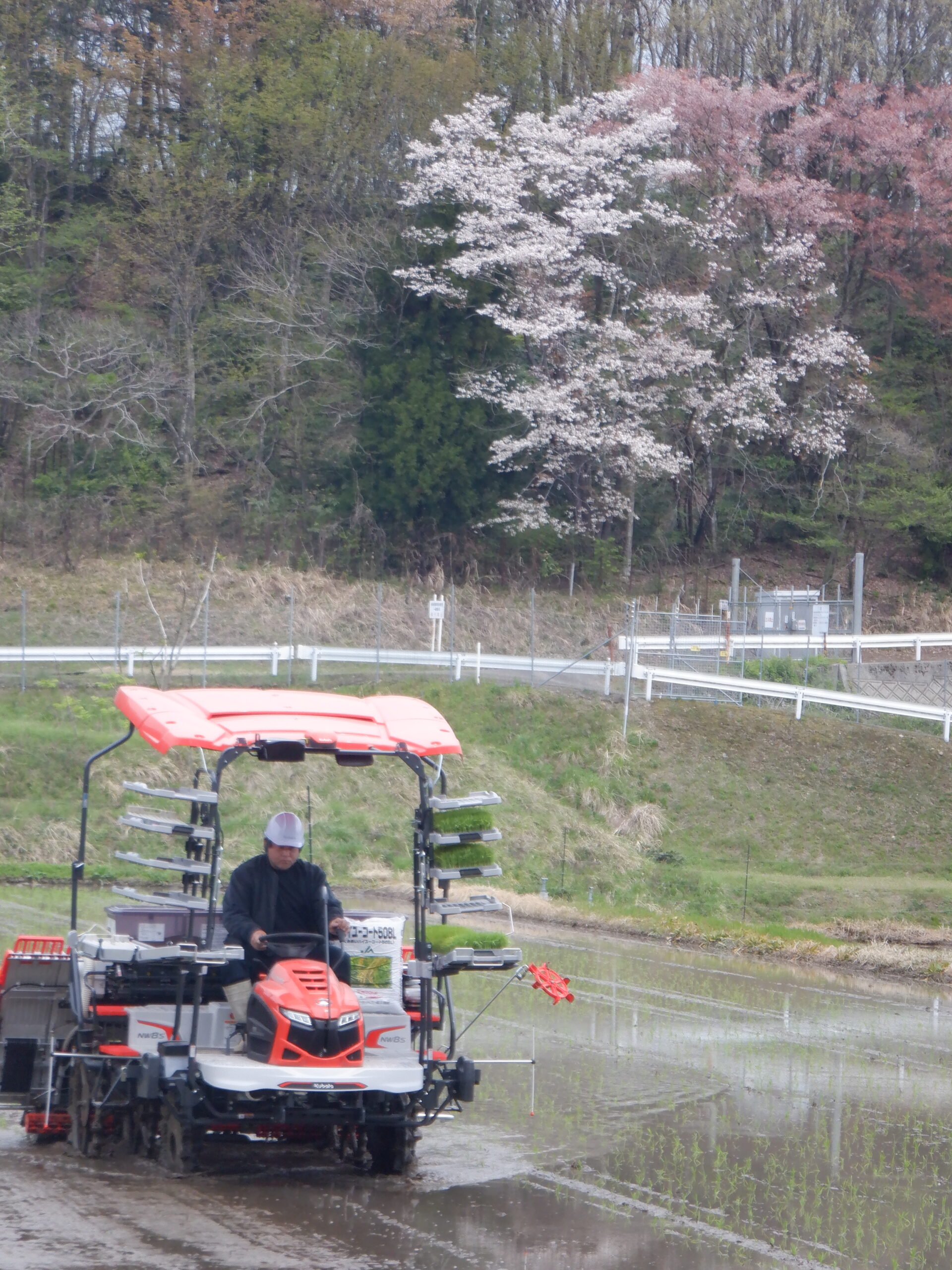 全国的な米不足と高値販売が続く中、いよいよ本格的に「田植え作業」がスタートしました。晴天の中、JA育苗センターで育てられた極早生品種『ハナエチゼン』の苗を社員が一斉に8台の田植機により植えていきました。