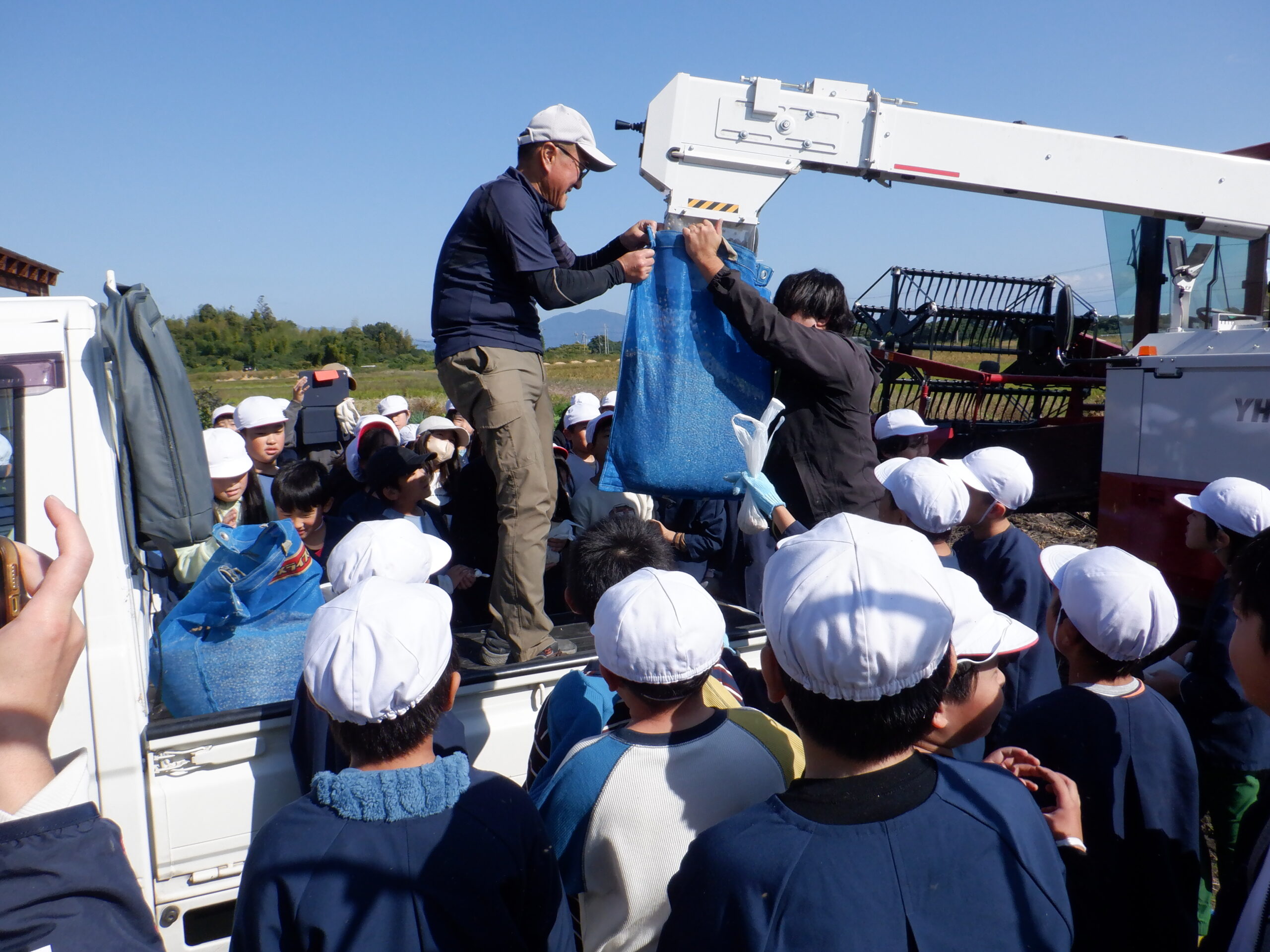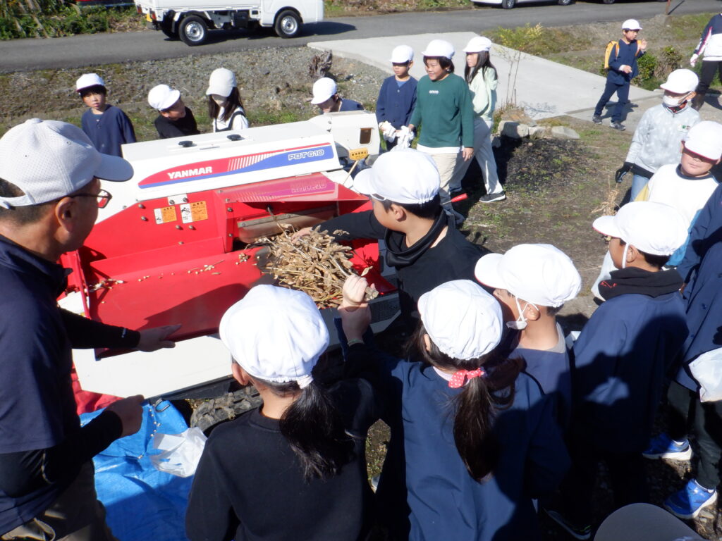 生徒たちは、収穫期を迎えた大豆を自分たちの手で株を引き抜き手作業で莢から実を獲ったり、脱粒機を使って莢から選別をしました。また、コンバインで刈取った大豆をタンクから搬出する作業を見学していろいろな収穫方法を学びました。